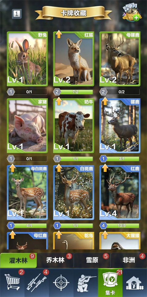 4、集卡特别设立集卡系统,为猎友们贴心收藏动物卡牌。每次狩猎可获取卡牌碎片解锁动物卡牌,每张卡牌都有不同的卡牌加成能力,升级卡牌可以提升卡牌技能,在猎友们狩猎结束时能提供更多分数。