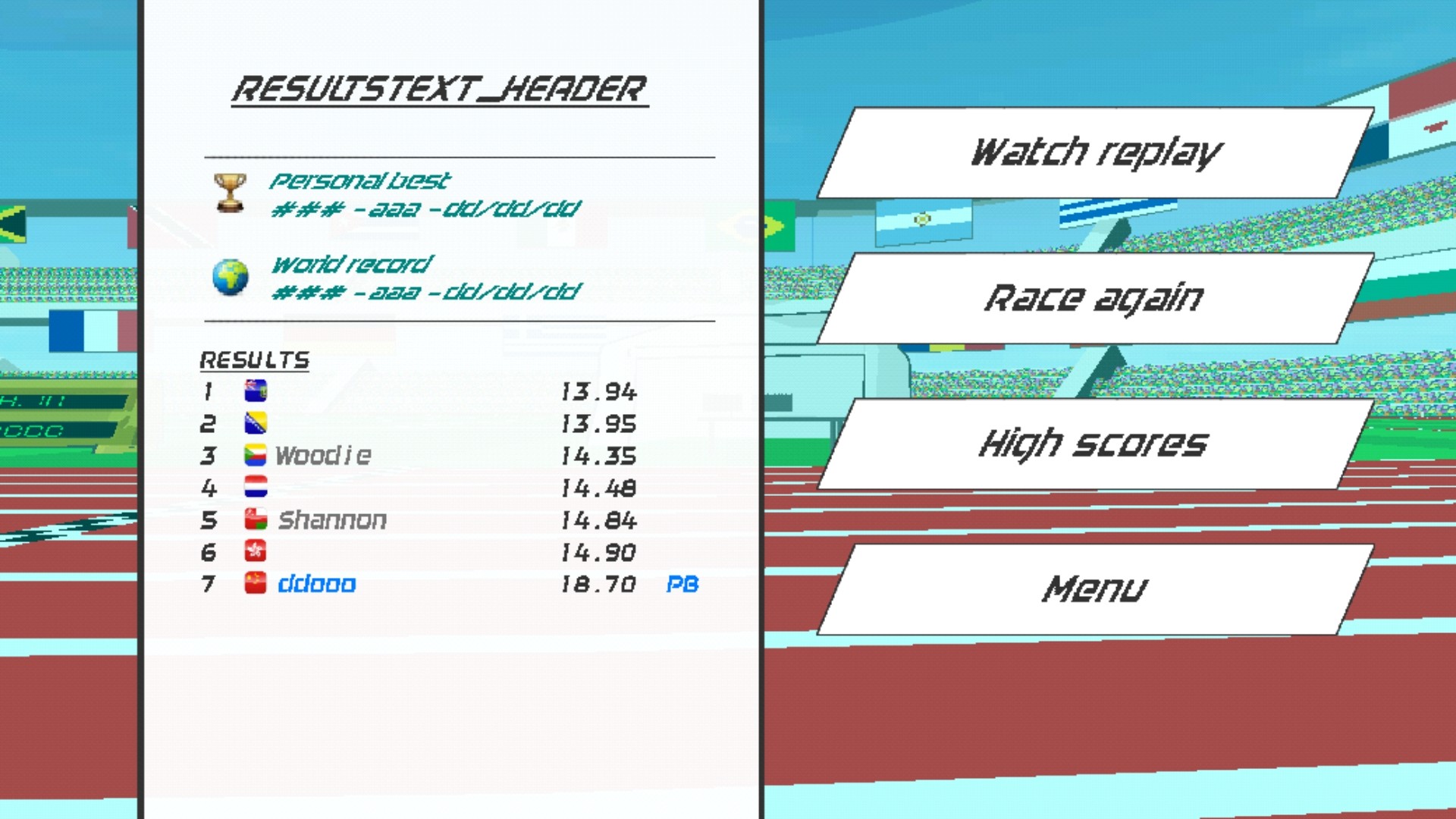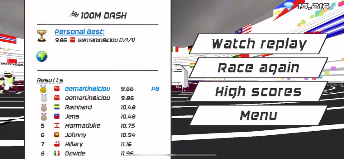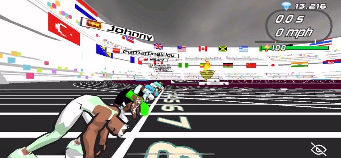 百米赛道设有预赛和决赛,一旦抢跑,将直接被红牌罚下。在雨天时,场地的抓地力会有所降低。全球排行榜按照大洲进行划分,其中亚洲区的记录单独统计。每周排名前一百的选手能够获得虚拟奖牌。
