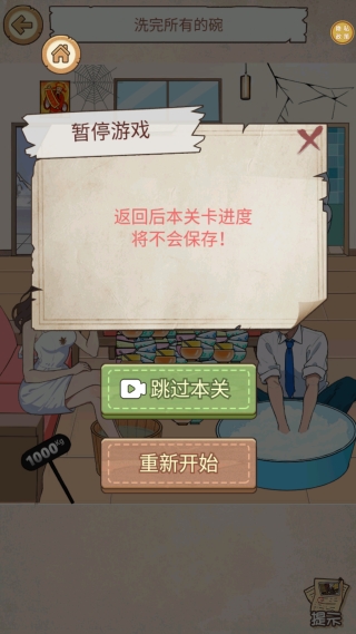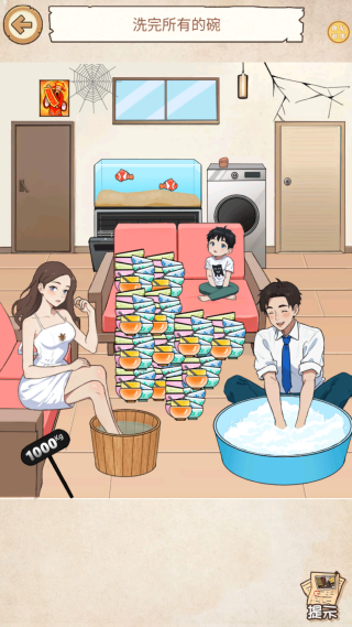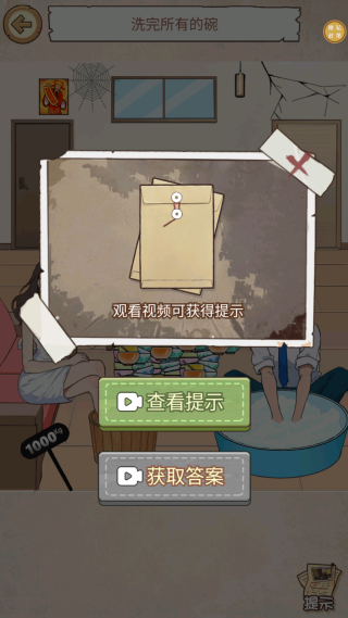 2、卡关可看提示,但先自行联想物品功能,比如洗碗关卡多尝试容器与水的关联。