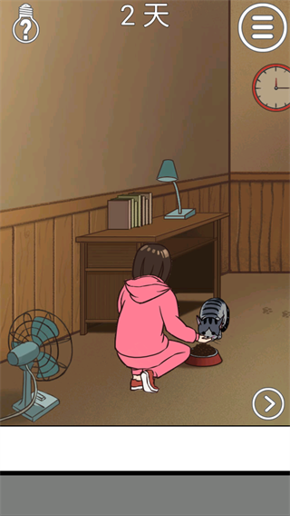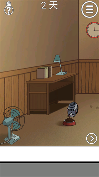 第九关:点左边房间的相框,输入密码6980,拿到鱼罐头,翻左边的书桌,里面有一把扇子,把鱼罐头倒在猫碗里,用扇子扇