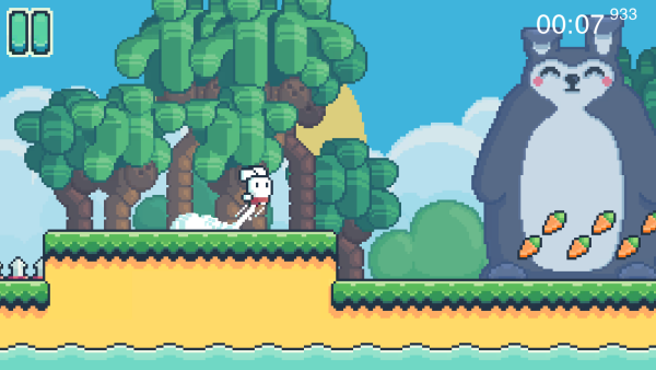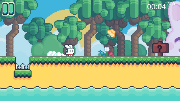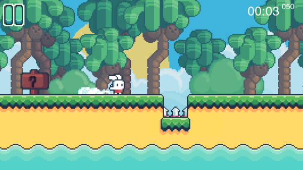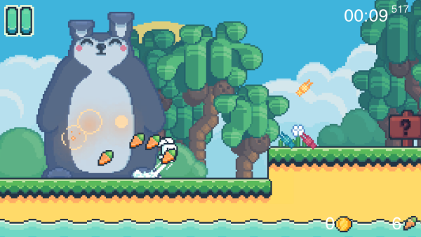 1、平台跳跃冒险,在不同关卡中控制小兔子跳跃、闪避,跨越沟壑与障碍,抵达终点解锁新区域。
