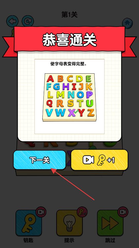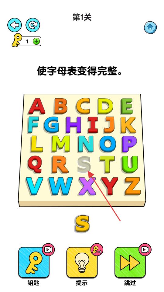 2、在第1关的界面中,你会看到一个任务,要求你使字母表变得完整,以及一个字母拼图。根据红色箭头的指示,将下方的字母拖动到相应的位置上,以完成字母表的拼接。