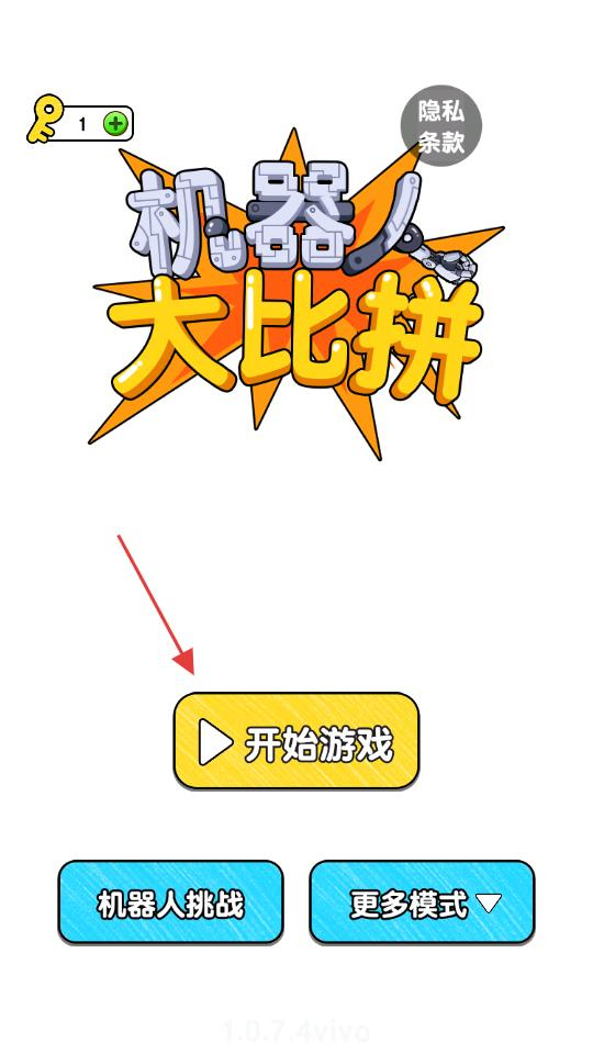 1、打开游戏后,在初始界面上你会看到“机器人大比拼”的标题和一个开始游戏的按钮。按照红色箭头指示点击这个按钮,这将启动关卡加载过程,并带你进入第1关的挑战准备阶段。