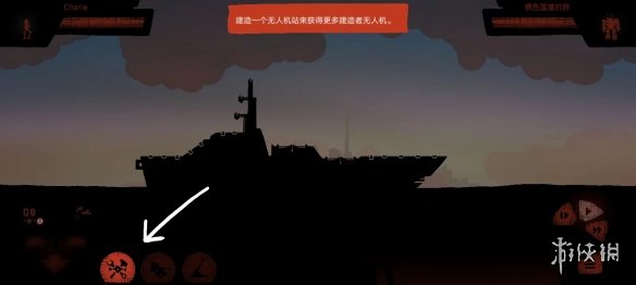 3、初次操作时,请点击底部箭头标识的无人机站图标进行首座防御设施建造。