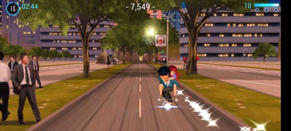 3、游戏开始会是一个男孩背着女孩通过滑板进行跑酷,遇到这种闪光,玩家需要左右滑动来触碰到闪光得分,触碰到越多分数也就越多。