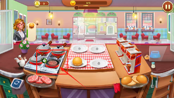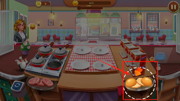4、点击桌上的牛排,然后跟面包放在一起,就能制作出汉堡了。