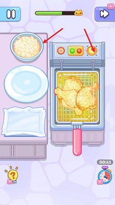 7、然后,我们就会来到炸鸡腿这一步,首先打开油锅加入油,将鸡腿过上面糊后放入油锅中,点击油锅右侧的按钮即可开始炸,炸熟之后捞出,关掉油锅即可。