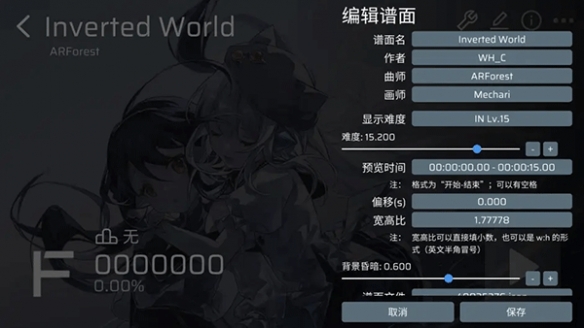点击铅笔图标,屏幕右侧将出现谱面设置界面,在此界面,你可以调节谱面定数、宽高比以及Tip等参数,请根据个人喜好自行调节,并记得保存设置。