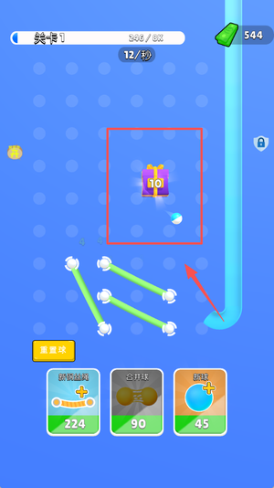4、小球要是打中带数字的礼盒,数字就会变小,等数字变成零,礼盒就开了,能拿到道具、皮肤或者通关奖励。