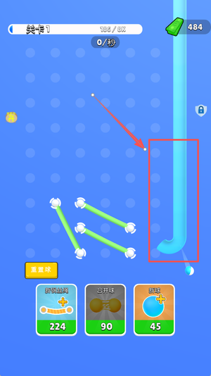 2、点屏幕让管道射出小球,调好角度,让它碰到绳索、风扇这些道具,改变方向完成弹射。