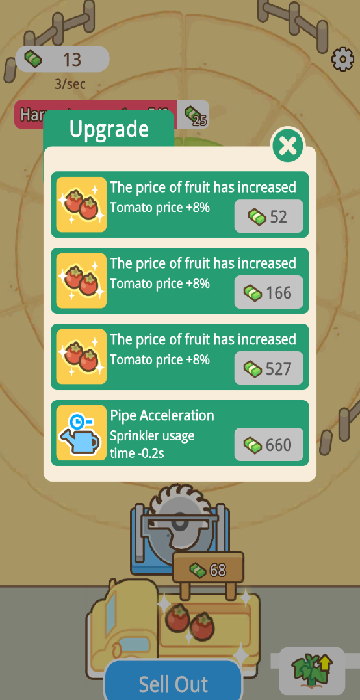 3、通过金币购买升级,如提升洒水速度、扩大耕作面积等,提高农场的生产效率。