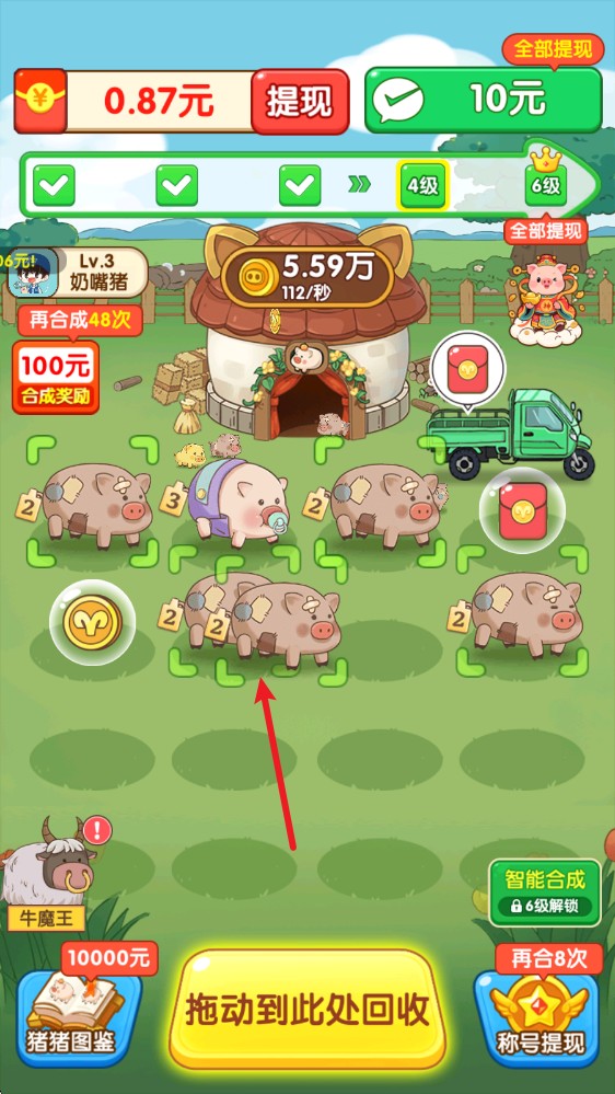 2、盯着提现门槛,比如差几元到10元,集中合成能领红包的高等级猪。