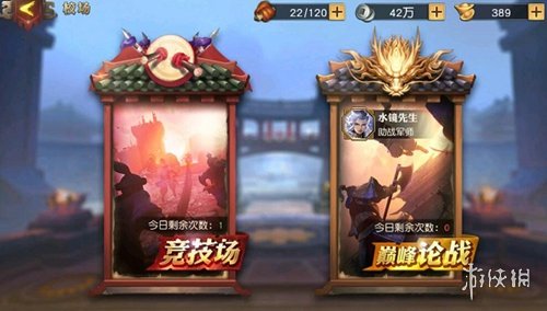 巅峰竞技场的入口与竞技场相同,位于页面中间的校场里,玩家只需点击相应按钮,即可进入军师选择竞技模式。