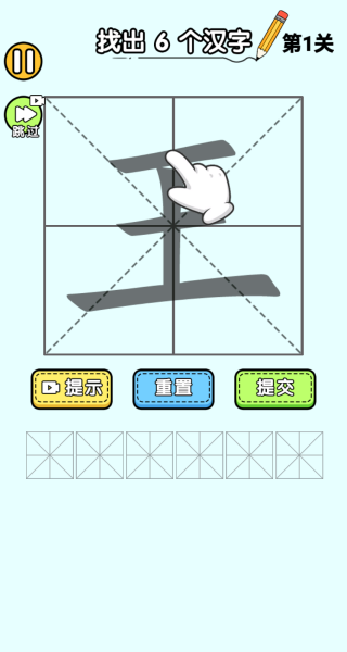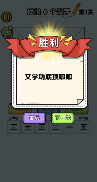 3、第一关是“王”字,要从中找出6个汉字:工、一、二、三、王、土,找对就过关。