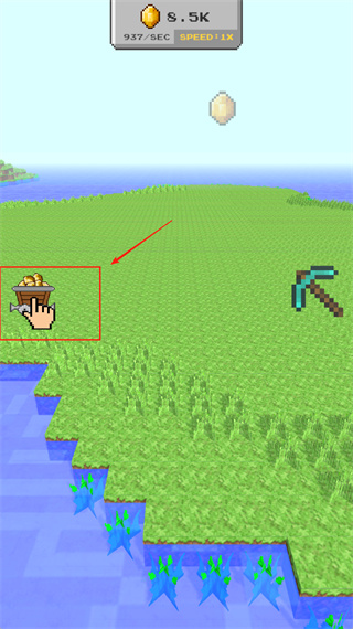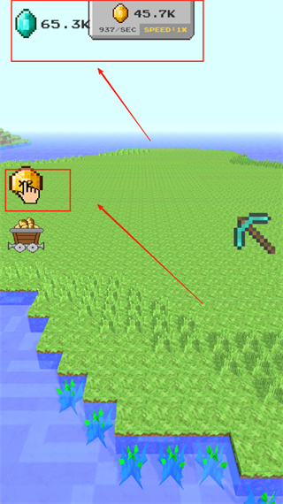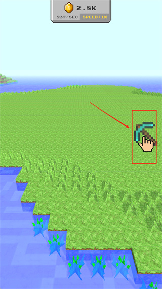 1. 轻点红色框中的蓝绿色镐子工具,采集草地上的资源,与此同时,关注顶部所显示的2.8K金币以及每秒937的收益速率。