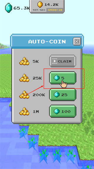 3、在自动金币面板中,点击标有数字5的绿色按钮,领取25K金币奖励,此时顶部会显示65.3K宝石和14.2K金币。