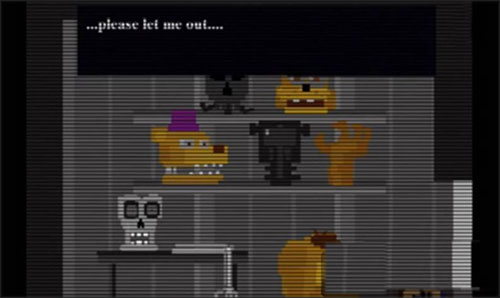 刚进入游戏,便看到一个小男孩被锁在屋子里。屋内除了小男孩,还有黄金泰迪熊以及前几代的玩具熊,分别是佛雷迪熊、奇卡鸡、邦尼兔和海盗狐狸。小男孩试图离开屋子,却未能成功。