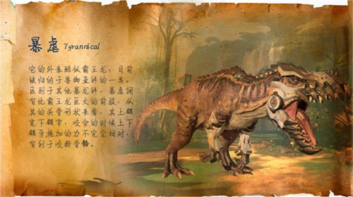 暴虐这一名字的由来和扎卡相关,它的外形与霸王龙极为相似,当前被划分在兽脚亚科类别之中。暴虐的诞生不同于其他常规巨兽,它代表着科学上的突破,堪称扎卡生物实验的杰出成果!