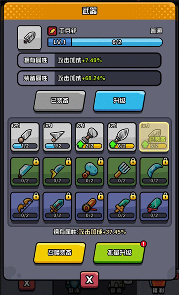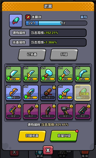 3、当玩家抽取到重复的武器或防具时,能够选择进行升级操作,只需点击批量升级按钮即可。