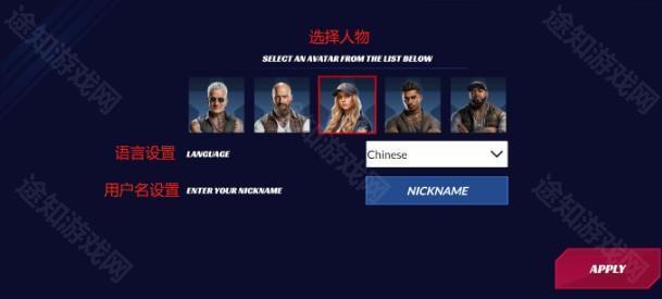 首先进入游戏后,游戏将会有人物、语言、角色命名这三个操作,共有四个人物让你选择,选择角色后,将游戏语言设置为中文(选择栏的最后一个),给自己的角色取个名字,这样第一步就算完成啦~