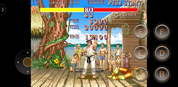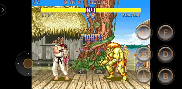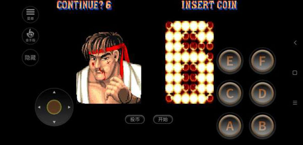 1. 开启街头霸王2汉化版手机版本,首先轻点“投币”,接着点击“开始”。