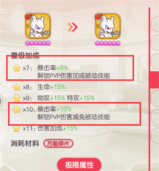 当然不是所有精灵的星级加成都有暴击的,比如超梦的7星跟10星加就是暴击率。