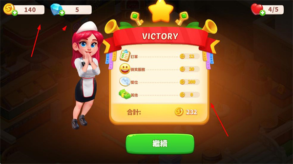4、达成特定经营目标后,将会呈现VICTORY界面,该界面会展示订单、微笑顾客、座位及其他方面的收益状况,各项收益合计后可获取相应金币。