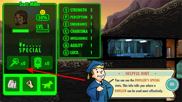 1. 点击避难所外的居民,打开其属性面板。居民的SPECIAL属性会影响他们在不同房间的工作效率,通过查看该面板能够合理安排岗位。