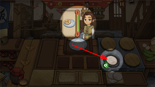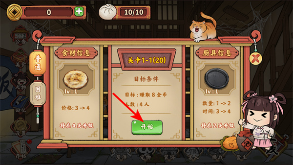 3、在关卡界面点击开始按钮,即可进入关卡1-1。在此关卡中,需要赚取8枚金币,服务4位客人,通过烹饪烧饼等食物来达成目标。