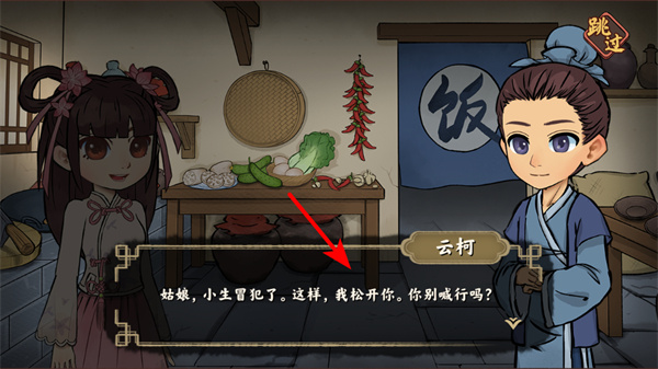 2、于剧情对话里,着重角色之间的互动。比如云柯的对话能够推动故事的发展,当完成互动之后,便可开启烹饪经营这一环节。