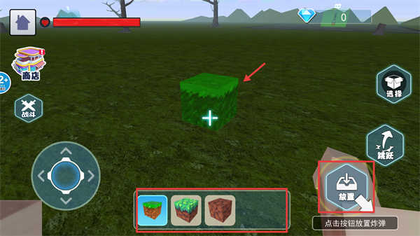 3、当切换至建造模式后,在下方方块栏挑选好方块,接着点击右侧的【放置】按钮,如此便可在场景中布置方块。