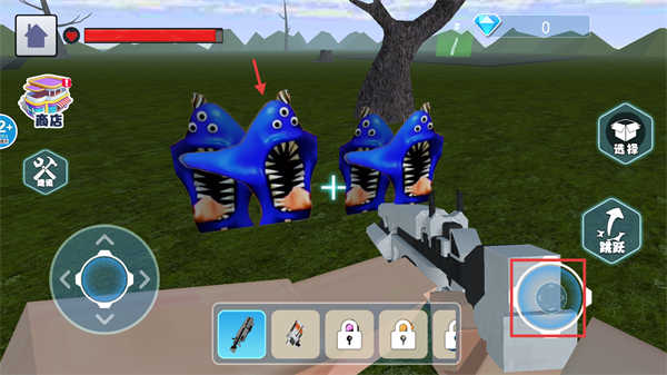 4、当遭遇蓝色多眼怪物时,要迅速瞄准它们,然后点击右侧的射击按键展开攻击,只有做到精准打击,才能成功击退这些怪物哦。
