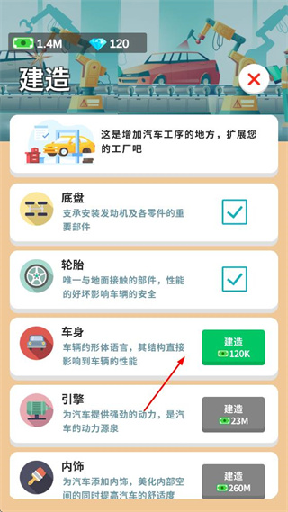 4、能够建造汽车的各类不同部件,像底盘、轮胎、车身、引擎、内饰等等。其中,建造车身需要耗费120K货币,建造引擎需要23M货币,建造内饰则需要260M货币。