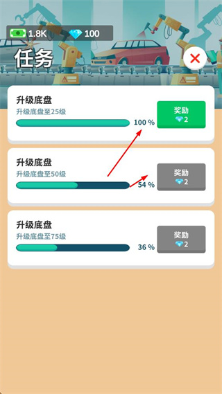 2、当完成升级底盘这一任务后,就能获取钻石奖励,只要任务进度达到100%,便可领取该奖励。