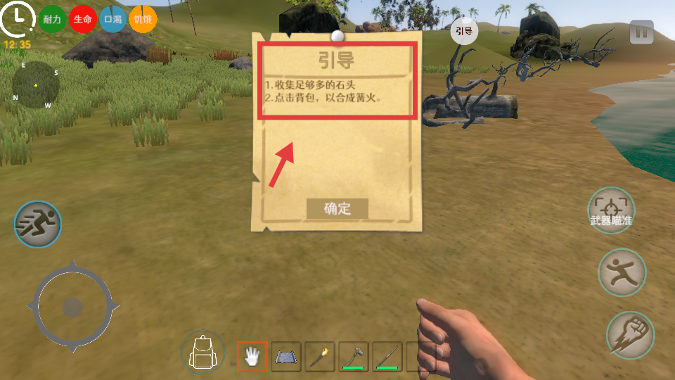 3、查看引导提示,依照“收集足够数量的石头,点击背包来合成篝火”的步骤开展操作。