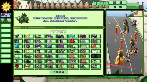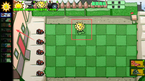 1. 在进入关卡之前,挑选初始的植物阵容。战斗开启后,依靠收集阳光来栽种像向日葵、豌豆射手、坚果墙这类基础植物。