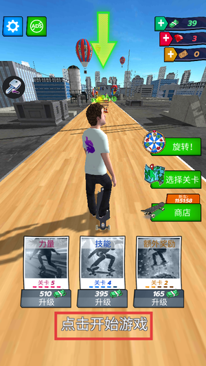 1. 开启游戏后,点击“开始游戏”按钮,进入关卡选择界面,准备开启滑板挑战流程。