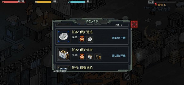 最后,还有在周二和周六开放的调查剧院任务。完成该任务可获得宠物升级材料、一块布料、一段绳子以及铜矿石。每次挑战需消耗5点健康值,每个关卡每天最多能挑战3次。