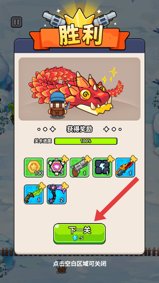 4、当关卡取得胜利后,点击【下一关】按键,接着挑战后续的关卡,以此积累更为丰富的奖励。
