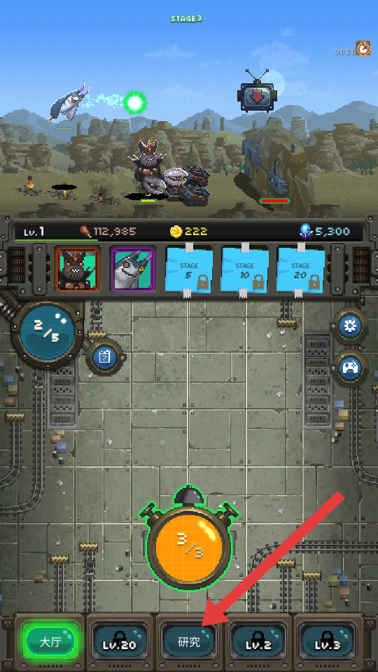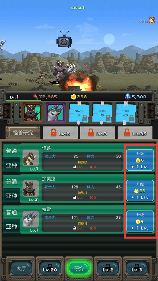 1. 轻点【研究】按钮,随即进入怪兽研究界面,在此界面能够查看并对怪兽属性进行升级。
