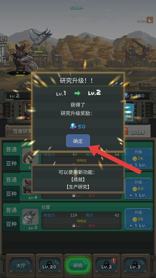 3、当研究完成升级,会弹出奖励面板,点击【确定】即可领取奖励,并解锁新功能,例如成就、生产研究等。