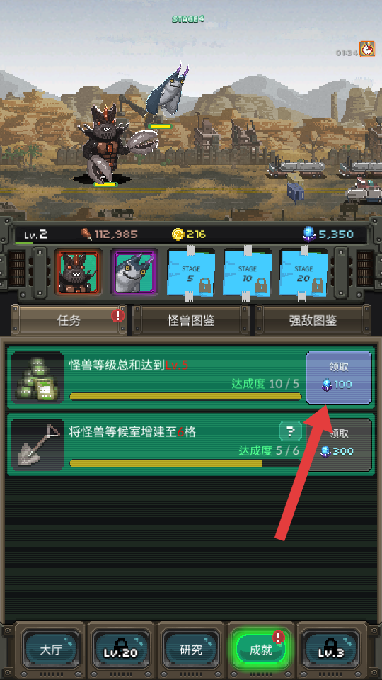 4、当完成任务(例如怪兽等级总和达到Lv.5 )之后,点击【领取】按钮,即可获取资源奖励,这些奖励可用来进一步推动游戏进度。