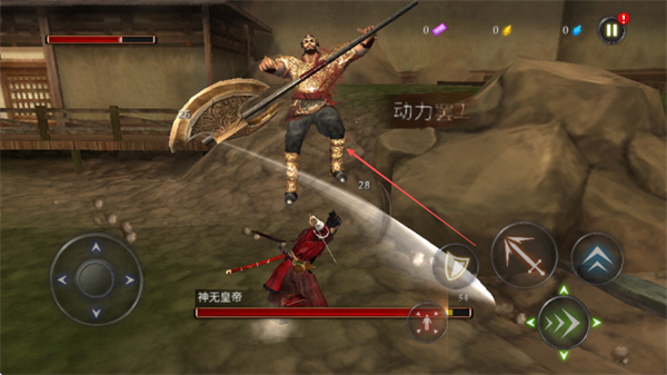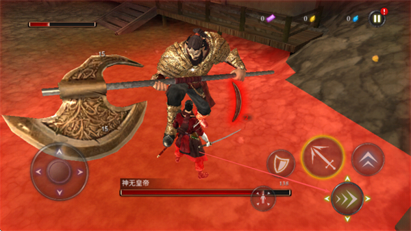 1. 通过操控左侧的虚拟摇杆来移动角色,以此躲避神无皇帝的巨斧攻击。与此同时,点击右侧的攻击按钮展开进攻,削减其血量。