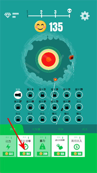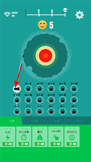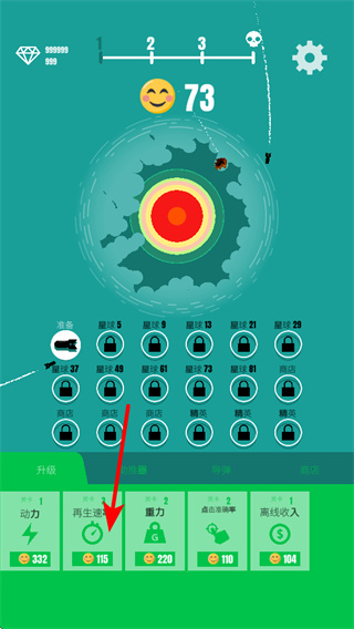 3、轻点重力升级按键,对物体的重力属性加以调整。重力会对物体的运行轨迹以及得分效率产生作用,合理进行升级能够提升游戏体验。