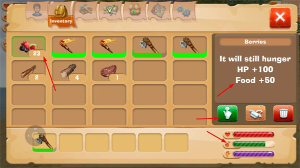 2. 通过食用浆果,能够恢复生命值(HP)与食物储备,使角色保持生存状态,为后续的持续探索打下基础。
