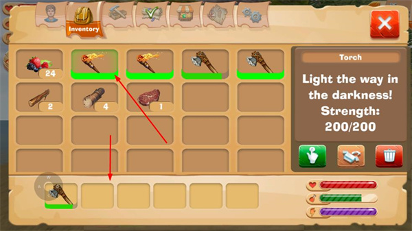 1、管理物品栏,使用火把在黑暗中照明,保障探索安全,开启探索之旅。