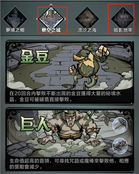 1、仅推荐悬空城与暗影地牢。前期毫无悬念选悬空城,这里能获取最多的秘境水晶,可快速兑换英雄,还能得到金豆子。