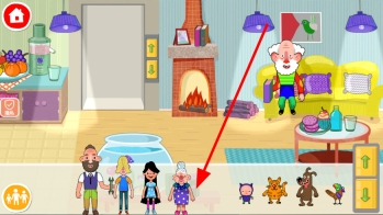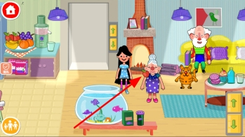 4、从桌上拿起水果,轻轻递至老奶奶嘴边,与老奶奶展开分享水果的互动,打造出温馨的生活场景氛围,使生活模拟更富趣味性。