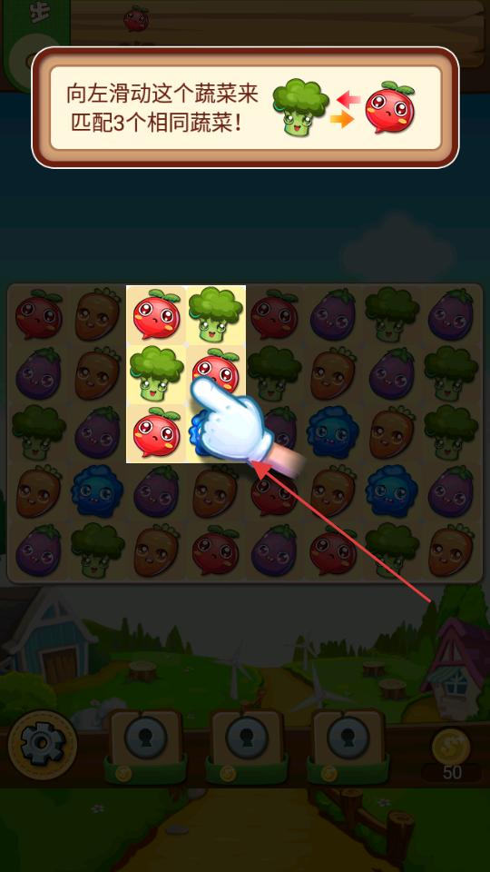 3、进入关卡后,按照提示,找出指定蔬菜,向左滑动该蔬菜,让它与相邻的相同蔬菜进行匹配,当凑齐3个相同蔬菜时就能实现消除,依照这个规则完成关卡内的消除任务。