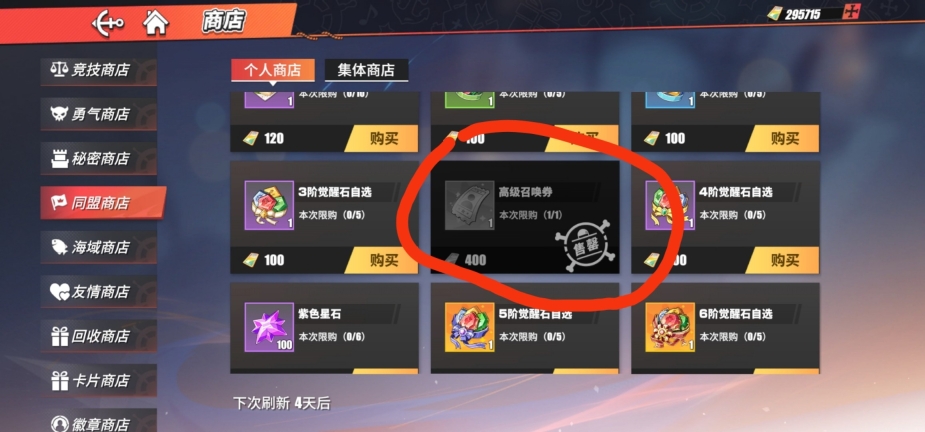 3. 同盟商店每周刷新时能够购买1张,若每月按照四周来计算,那么每月可以获得4张高招。